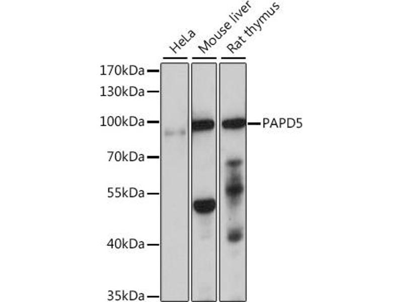 Terminal nucleotidyltransferase that catalyzes preferentially the transfert of ATP and GTP on RNA 3' poly(A tail creating a heterogeneous 3' poly(A tail leading to mRNAs stabilization by protecting mRNAs from active deadenylation. Also functions as a catalytic subunit of a TRAMP-like complex which has a poly(A RNA polymerase activity and is involved in a post-transcriptional quality control mechanism. Polyadenylation with short oligo(A tails is required for the degradative activity of the exosome on several of its nuclear RNA substrates. Doesn't need a cofactor for polyadenylation activity (in vitro. Required for cytoplasmic polyadenylation of mRNAs involved in carbohydrate metabolism, including the glucose transporter SLC2A1/GLUT1. Plays a role in replication-dependent histone mRNA degradation, probably through terminal uridylation of mature histone mRNAs. May play a role in sister chromatid cohesion. Mediates 3' adenylation of the microRNA MIR21 followed by its 3'-to-5' trimming by the exoribonuclease PARN leading to degradation. Mediates 3' adenylation of H/ACA box snoRNAs (small nucleolar RNAs followed by its 3'-to-5' trimming by the exoribonuclease PARN which enhances snoRNA stability and maturation.,PAPD5,TRF4-2,Epigenetics & Nuclear Signaling,RNA Binding,Cancer,Drug resistance,Topoisomerases,PAPD5
