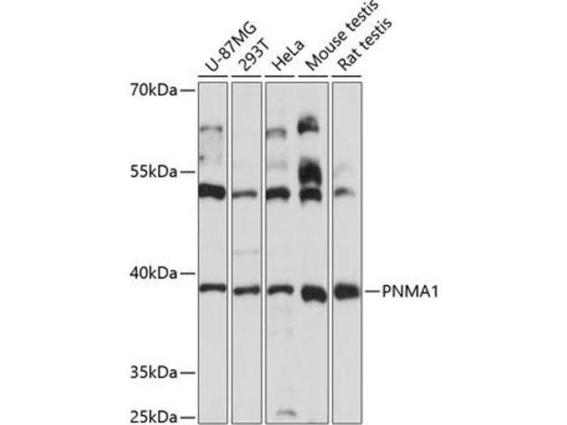 This gene encodes a neuron- and testis-specific protein that is also expressed in some paraneoplastic syndromes affecting the nervous system. Some patients with neurologic disorders develop antibodies against the protein encoded by this gene. The identification of the antineuronal antibodies in the sera of these patients has facilitated the diagnosis of paraneoplastic neurological disorders and the early detection of the associated tumors.,PNMA1,MA1,Immunology & Inflammation,Neuroscience,PNMA1