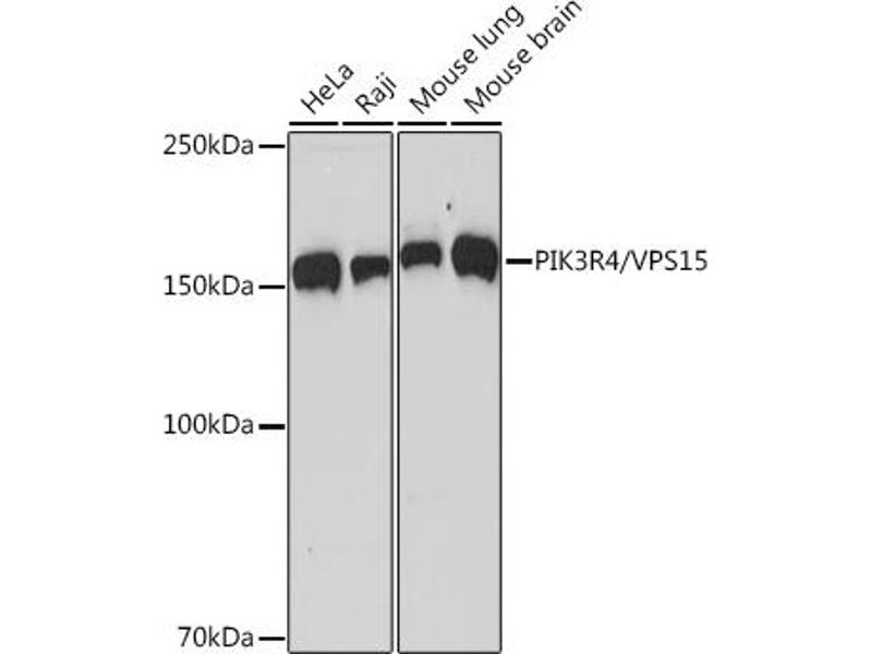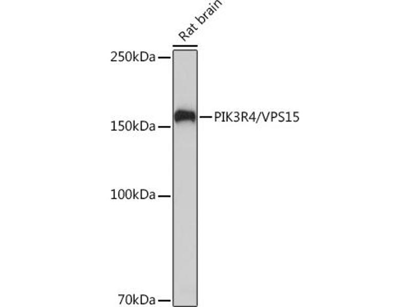 Regulatory subunit of the PI3K complex that mediates formation of phosphatidylinositol 3-phosphate, different complex forms are believed to play a role in multiple membrane trafficking pathways: PI3KC3-C1 is involved in initiation of autophagosomes and PI3KC3-C2 in maturation of autophagosomes and endocytosis. Involved in regulation of degradative endocytic trafficking and cytokinesis, probably in the context of PI3KC3-C2.,VPS15, p150,AMPK Signaling Pathway,Angiogenesis,Apoptosis,Apoptosis_Inhibition of Apoptosis,Apoptosis_Mitochondrial Control of Apoptosis,Autophagy,Autophagy_Regulator,Cardiovascular,Cell Adhesion,Cell Biology & Developmental Biology,Cytoskeleton,Cytoskeleton_Actins,Cytoskeleton_Microtubules,Endocrine & Metabolism,Epigenetics & Nuclear Signaling,ErbB-HER Signaling Pathway,ESC Pluripotency and Differentiation,IL-6 Receptor Signaling Pathway,Immunology & Inflammation,Kinase,Kinase_Serine/threonine kinases,Lipid Metabolism,MAPK-Erk Signaling Pathway,MAPK-JNK Signaling Pathway,mTOR Signaling Pathway,NF-kB Signaling Pathway,PI3K-Akt Signaling Pathway,Signal Transduction,T Cell Receptor Signaling Pathway,TGF-b-Smad Signaling Pathway,Translation Control,Translational Control_Regulation of eIF4 and p70 S6 Kinase,Warburg Effect,PIK3R4