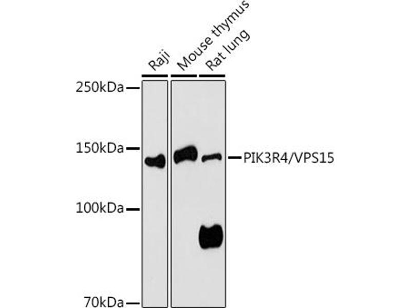 Regulatory subunit of the PI3K complex that mediates formation of phosphatidylinositol 3-phosphate, different complex forms are believed to play a role in multiple membrane trafficking pathways: PI3KC3-C1 is involved in initiation of autophagosomes and PI3KC3-C2 in maturation of autophagosomes and endocytosis. Involved in regulation of degradative endocytic trafficking and cytokinesis, probably in the context of PI3KC3-C2.,PIK3R4,VPS15,p150,Epigenetics & Nuclear Signaling,Translation Control,Regulation of eIF4 and p70 S6 Kinase,Signal Transduction,Kinase,Serine/threonine kinases,PI3K-Akt Signaling Pathway,mTOR Signaling Pathway,ErbB-HER Signaling Pathway,MAPK-Erk Signaling Pathway,MAPK-JNK Signaling Pathway,Cell Biology & Developmental Biology,Apoptosis,Mitochondrial Control of Apoptosis,Inhibition of Apoptosis,Autophagy,Cell Adhesion,Cytoskeleton,Microtubules,Actins,TGF-b-Smad Signaling Pathway,ESC Pluripotency and Differentiation,Endocrine & Metabolism,Lipid Metabolism,AMPK Signaling Pathway,Warburg Effect,Immunology & Inflammation,T Cell Receptor Signaling Pathway,IL-6 Receptor Signaling Pathway,NF-kB Signaling Pathway,Cardiovascular,Angiogenesis,Regulators,PIK3R4
