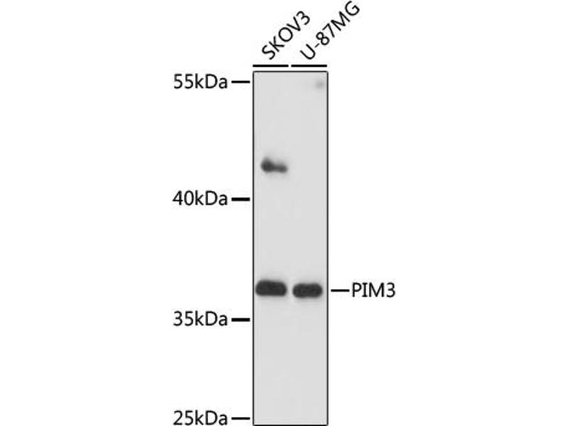 The protein encoded by this gene belongs to the Ser/Thr protein kinase family, and PIM subfamily. This gene is overexpressed in hematological and epithelial tumors and is associated with MYC coexpression. It plays a role in the regulation of signal transduction cascades, contributing to both cell proliferation and survival, and provides a selective advantage in tumorigenesis.,PIM3,pim-3,Epigenetics & Nuclear Signaling,Cancer,Signal Transduction,Kinase,Serine/threonine kinases,PIM3