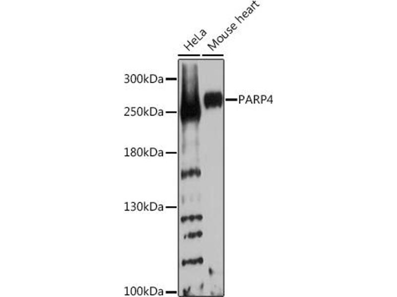 This gene encodes poly(ADP-ribosyl)transferase-like 1 protein, which is capable of catalyzing a poly(ADP-ribosyl)ation reaction. This protein has a catalytic domain which is homologous to that of poly (ADP-ribosyl) transferase, but lacks an N-terminal DNA binding domain which activates the C-terminal catalytic domain of poly (ADP-ribosyl) transferase. Since this protein is not capable of binding DNA directly, its transferase activity may be activated by other factors such as protein-protein interaction mediated by the extensive carboxyl terminus.,PARP4,ADPRTL1,ARTD4,PARP-4,PARPL,PH5P,VAULT3,VPARP,VWA5C,p193,Epigenetics & Nuclear Signaling,Cell Biology & Developmental Biology,Apoptosis,Cell Cycle,Centrosome,PARP4