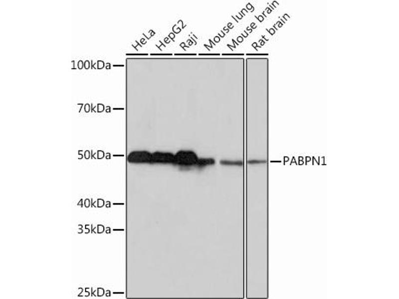 This gene encodes an abundant nuclear protein that binds with high affinity to nascent poly(A) tails. The protein is required for progressive and efficient polymerization of poly(A) tails at the 3' ends of eukaryotic transcripts and controls the size of the poly(A) tail to about 250 nt. At steady-state, this protein is localized in the nucleus whereas a different poly(A) binding protein is localized in the cytoplasm. This gene contains a GCG trinucleotide repeat at the 5' end of the coding region, and expansion of this repeat from the normal 6 copies to 8-13 copies leads to autosomal dominant oculopharyngeal muscular dystrophy (OPMD) disease. Related pseudogenes have been identified on chromosomes 19 and X. Read-through transcription also exists between this gene and the neighboring upstream BCL2-like 2 (BCL2L2) gene. [provided by RefSeq, Dec 2010],OPMD, PAB2, PABII, PABP-2, PABP2,Epigenetics & Nuclear Signaling,RNA Binding,PABPN1