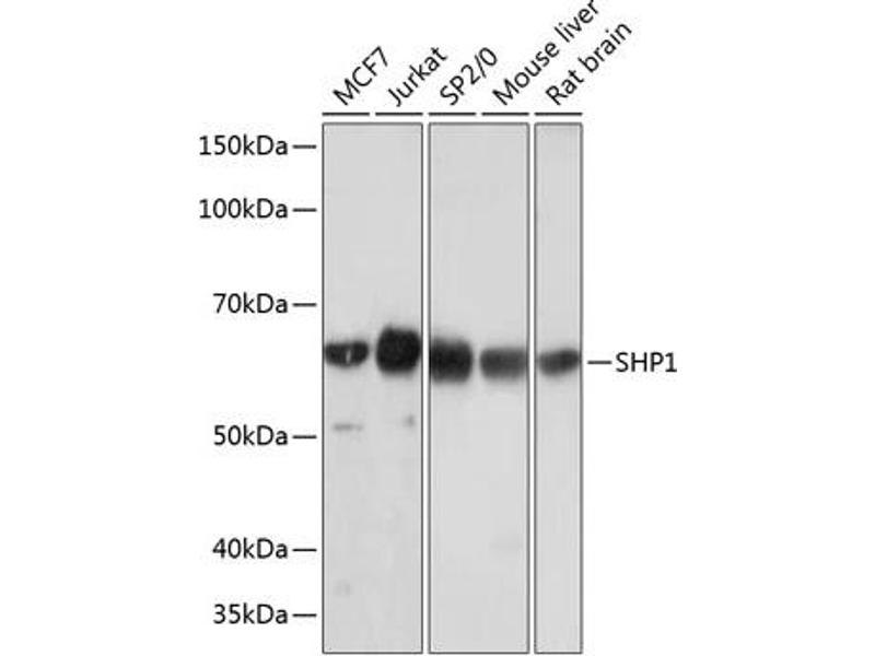 The protein encoded by this gene is a member of the protein tyrosine phosphatase (PTP) family. PTPs are known to be signaling molecules that regulate a variety of cellular processes including cell growth, differentiation, mitotic cycle, and oncogenic transformation. N-terminal part of this PTP contains two tandem Src homolog (SH2) domains, which act as protein phospho-tyrosine binding domains, and mediate the interaction of this PTP with its substrates. This PTP is expressed primarily in hematopoietic cells, and functions as an important regulator of multiple signaling pathways in hematopoietic cells. This PTP has been shown to interact with, and dephosphorylate a wide spectrum of phospho-proteins involved in hematopoietic cell signaling. Multiple alternatively spliced variants of this gene, which encode distinct isoforms, have been reported. [provided by RefSeq, Jul 2008],HCP,HCPH,HPTP1C,PTP-1C,SH-PTP1,SHP-1,SHP-1L,SHP1,CTCN6,PTPN6,Apoptosis,B Cell Receptor Signaling Pathway,Cancer,Cell Biology & Developmental Biology,Cell Cycle,G protein signaling,G protein signaling_G-Protein-Coupled Receptors(GPCR),IL-6 Receptor Signaling Pathway,Immunology & Inflammation,Kinase,Kinase_Tyrosine kinases,Protein phosphorylation,Signal Transduction,PTPN6