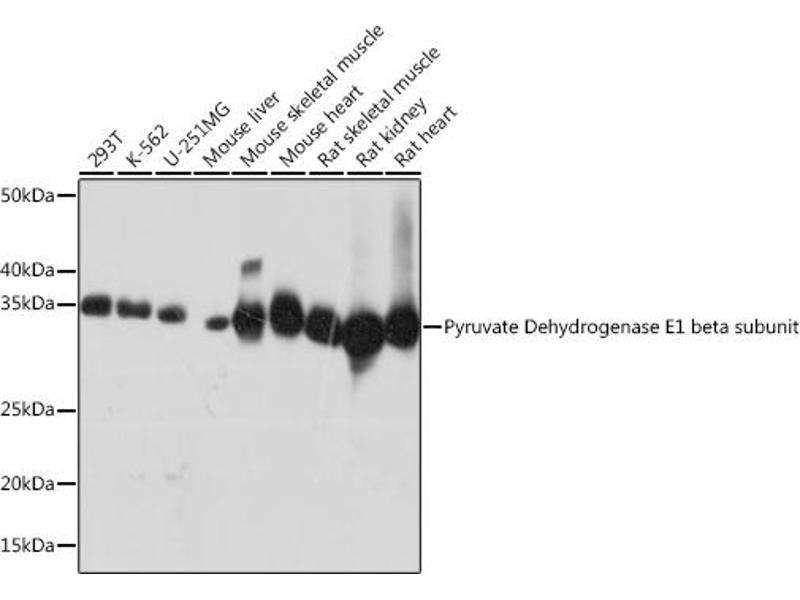 The pyruvate dehydrogenase (PDH) complex is a nuclear-encoded mitochondrial multienzyme complex that catalyzes the overall conversion of pyruvate to acetyl-CoA and carbon dioxide, and provides the primary link between glycolysis and the tricarboxylic acid (TCA) cycle. The PDH complex is composed of multiple copies of three enzymatic components: pyruvate dehydrogenase (E1), dihydrolipoamide acetyltransferase (E2) and lipoamide dehydrogenase (E3). The E1 enzyme is a heterotetramer of two alpha and two beta subunits. This gene encodes the E1 beta subunit. Mutations in this gene are associated with pyruvate dehydrogenase E1-beta deficiency. Alternatively spliced transcript variants have been found for this gene. [provided by RefSeq, Mar 2012],PDHBD, PDHE1-B, PHE1B,Cancer,Carbohydrate metabolism,Endocrine & Metabolism,Mitochondrial metabolism,Mitochondrial metabolism_Mitochondrial markers,Signal Transduction,Warburg Effect,PDHB
