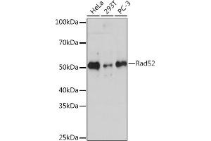 The protein encoded by this gene shares similarity with Saccharomyces cerevisiae Rad52, a protein important for DNA double-strand break repair and homologous recombination. This gene product was shown to bind single-stranded DNA ends, and mediate the DNA-DNA interaction necessary for the annealing of complementary DNA strands. It was also found to interact with DNA recombination protein RAD51, which suggested its role in RAD51 related DNA recombination and repair. A pseudogene of this gene is present on chromosome 2. Alternative splicing results in multiple transcript variants. Additional alternatively spliced transcript variants of this gene have been described, but their full-length nature is not known. [provided by RefSeq, Jul 2014],RAD52, DNA repair protein RAD52 homolog,Cell Biology & Developmental Biology,Cell Cycle,DNA Damage & Repair,Epigenetics & Nuclear Signaling,G2/M DNA Damage Checkpoint,RAD52
