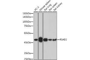 Interferon-inducible antiviral protein which plays a major role in the cell antiviral state induced by type I and type II interferon. Catalyzes the conversion of cytidine triphosphate (CTP to 3'-deoxy-3',4'-didehydro-CTP (ddhCTP via a SAM-dependent radical mechanism. In turn, ddhCTP acts as a chain terminator for the RNA-dependent RNA polymerases from multiple viruses and directly inhibits viral replication. Therefore, inhibits a wide range of DNA and RNA viruses, including human cytomegalovirus (HCMV, hepatitis C virus (HCV, west Nile virus (WNV, dengue virus, sindbis virus, influenza A virus, sendai virus, vesicular stomatitis virus (VSV, zika virus, and human immunodeficiency virus (HIV-1. Promotes also TLR7 and TLR9-dependent production of IFN-beta production in plasmacytoid dendritic cells (pDCs by facilitating 'Lys-63'-linked ubiquitination of IRAK1 by TRAF6. Plays a role in CD4+ T-cells activation and differentiation. Facilitates T-cell receptor (TCR-mediated GATA3 activation and optimal T-helper 2 (Th2 cytokine production by modulating NFKB1 and JUNB activities. Can inhibit secretion of soluble proteins.,RSAD2,2510004L01Rik,cig33,cig5,vig1,Immunology & Inflammation,RSAD2