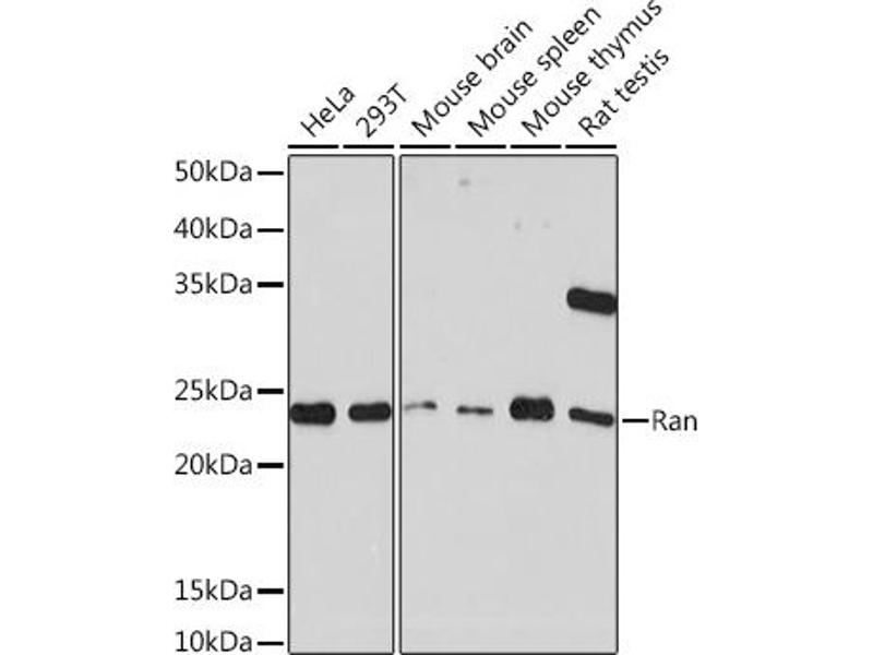 RAN (ras-related nuclear protein) is a small GTP binding protein belonging to the RAS superfamily that is essential for the translocation of RNA and proteins through the nuclear pore complex. The RAN protein is also involved in control of DNA synthesis and cell cycle progression. Nuclear localization of RAN requires the presence of regulator of chromosome condensation 1 (RCC1). Mutations in RAN disrupt DNA synthesis. Because of its many functions, it is likely that RAN interacts with several other proteins. RAN regulates formation and organization of the microtubule network independently of its role in the nucleus-cytosol exchange of macromolecules. RAN could be a key signaling molecule regulating microtubule polymerization during mitosis. RCC1 generates a high local concentration of RAN-GTP around chromatin which, in turn, induces the local nucleation of microtubules. RAN is an androgen receptor (AR) coactivator that binds differentially with different lengths of polyglutamine within the androgen receptor. Polyglutamine repeat expansion in the AR is linked to Kennedy's disease (X-linked spinal and bulbar muscular atrophy). RAN coactivation of the AR diminishes with polyglutamine expansion within the AR, and this weak coactivation may lead to partial androgen insensitivity during the development of Kennedy's disease. [provided by RefSeq, Jul 2008],ARA24, Gsp1, TC4,Cell Biology & Developmental Biology,Cell Cycle,Cell Cycle_Centrosome,Epigenetics & Nuclear Signaling,G protein signaling,G protein signaling_Small G proteins,Nuclear Receptor Signaling,RNA Binding,Signal Transduction,RAN