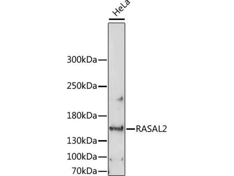 This gene encodes a protein that contains the GAP-related domain (GRD), a characteristic domain of GTPase-activating proteins (GAPs). GAPs function as activators of Ras superfamily of small GTPases. The protein encoded by this gene is able to complement the defective RasGAP function in a yeast system. Two alternatively spliced transcript variants of this gene encoding distinct isoforms have been reported.,RASAL2,NGAP,Signal Transduction,G protein signaling,Signal Transduction,RASAL2