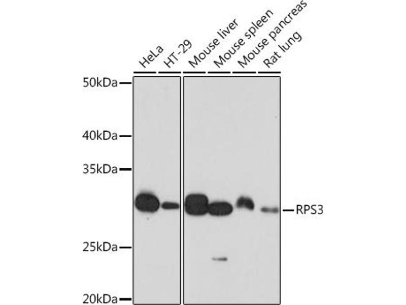 Ribosomes, the organelles that catalyze protein synthesis, consist of a small 40S subunit and a large 60S subunit. Together these subunits are composed of 4 RNA species and approximately 80 structurally distinct proteins. This gene encodes a ribosomal protein that is a component of the 40S subunit, where it forms part of the domain where translation is initiated. The protein belongs to the S3P family of ribosomal proteins. Studies of the mouse and rat proteins have demonstrated that the protein has an extraribosomal role as an endonuclease involved in the repair of UV-induced DNA damage. The protein appears to be located in both the cytoplasm and nucleus but not in the nucleolus. Higher levels of expression of this gene in colon adenocarcinomas and adenomatous polyps compared to adjacent normal colonic mucosa have been observed. This gene is co-transcribed with the small nucleolar RNA genes U15A and U15B, which are located in its first and fifth introns, respectively. As is typical for genes encoding ribosomal proteins, there are multiple processed pseudogenes of this gene dispersed through the genome. Multiple alternatively spliced transcript variants encoding different isoforms have been found for this gene. [provided by RefSeq, May 2012],S3,Apoptosis,Cell Biology & Developmental Biology,DNA Damage & Repair,Epigenetics & Nuclear Signaling,RNA Binding,RPS3