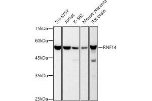 The protein encoded by this gene contains a RING zinc finger, a motif known to be involved in protein-protein interactions. This protein interacts with androgen receptor (AR) and may function as a coactivator that induces AR target gene expression in prostate. A dominant negative mutant of this gene has been demonstrated to inhibit the AR-mediated growth of prostate cancer. This protein also interacts with class III ubiquitin-conjugating enzymes (E2s) and may act as a ubiquitin-ligase (E3) in the ubiquitination of certain nuclear proteins. Six alternatively spliced transcript variants encoding two distinct isoforms have been reported. [provided by RefSeq, Jan 2011],RNF14,ARA54,HFB30,HRIHFB2038,TRIAD2,Epigenetics & Nuclear Signaling,Nuclear Receptor Signaling,Nuclear hormone receptors,Signal Transduction,Cell Biology & Developmental Biology,Ubiquitin,RNF14