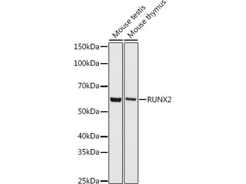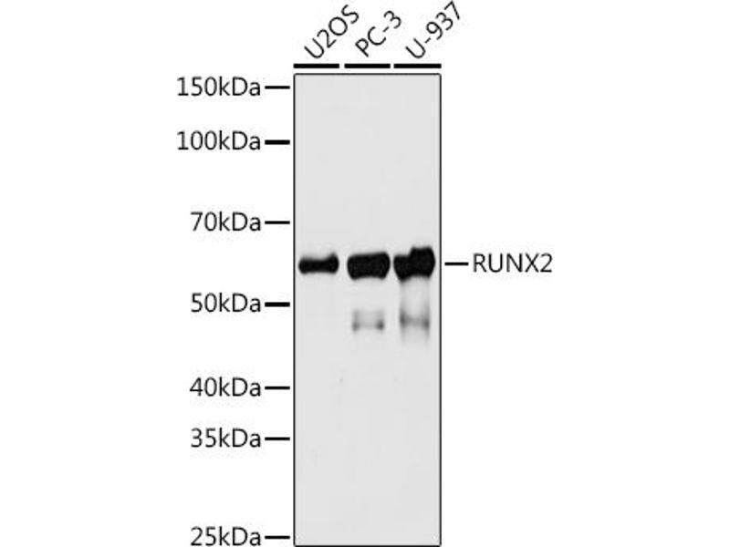 This gene is a member of the RUNX family of transcription factors and encodes a nuclear protein with an Runt DNA-binding domain. This protein is essential for osteoblastic differentiation and skeletal morphogenesis and acts as a scaffold for nucleic acids and regulatory factors involved in skeletal gene expression. The protein can bind DNA both as a monomer or, with more affinity, as a subunit of a heterodimeric complex. Two regions of potential trinucleotide repeat expansions are present in the N-terminal region of the encoded protein, and these and other mutations in this gene have been associated with the bone development disorder cleidocranial dysplasia (CCD). Transcript variants that encode different protein isoforms result from the use of alternate promoters as well as alternate splicing. [provided by RefSeq, Jul 2016],AML3, CBF-alpha-1, CBFA1, CCD, CCD1, CLCD, OSF-2, OSF2, PEA2aA, PEBP2aA,Cell Biology & Developmental Biology,Epigenetics & Nuclear Signaling,Extracellular Matrix,Extracellular Matrix_Bone,Hippo Signaling Pathway,Mesenchymal Stem Cells,Stem Cells,TGF-b-Smad Signaling Pathway_Target gene,Transcription Factors,RUNX2