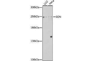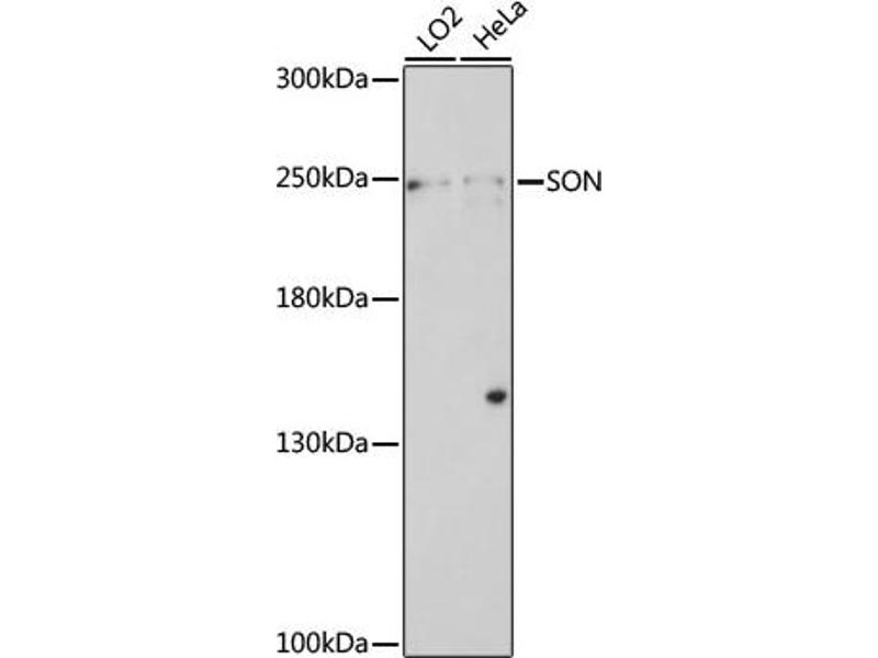 This gene encodes a protein that contains multiple simple repeats. The encoded protein binds RNA and promotes pre-mRNA splicing, particularly of transcripts with poor splice sites. The protein also recognizes a specific DNA sequence found in the human hepatitis B virus (HBV) and represses HBV core promoter activity. There is a pseudogene for this gene on chromosome 1. Alternative splicing results in multiple transcript variants.,SON,BASS1,C21orf50,DBP-5,NREBP,SON3,TOKIMS,Epigenetics & Nuclear Signaling,RNA Binding,Cancer,Cell Biology & Developmental Biology,Apoptosis,Cell Cycle,Endocrine & Metabolism,SON