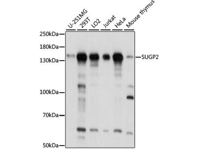 Recombinant fusion protein containing a sequence corresponding to amino acids 500-700 of human SUGP2 (NP_055699.2).
