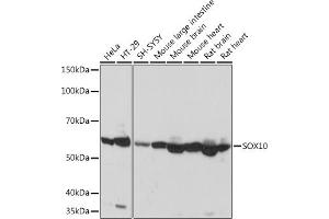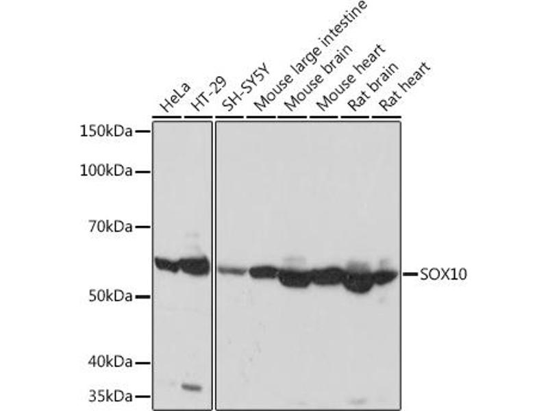 This gene encodes a member of the SOX (SRY-related HMG-box) family of transcription factors involved in the regulation of embryonic development and in the determination of the cell fate. The encoded protein may act as a transcriptional activator after forming a protein complex with other proteins. This protein acts as a nucleocytoplasmic shuttle protein and is important for neural crest and peripheral nervous system development. Mutations in this gene are associated with Waardenburg-Shah and Waardenburg-Hirschsprung disease. [provided by RefSeq, Jul 2008],DOM, PCWH, WS2E, WS4, WS4C,Cell Biology & Developmental Biology,Cell Type Marker,Cell Type Marker_Neural Stem Cell marker,Epigenetics & Nuclear Signaling,Neuroscience,Stem Cells,Transcription Factors,SOX10