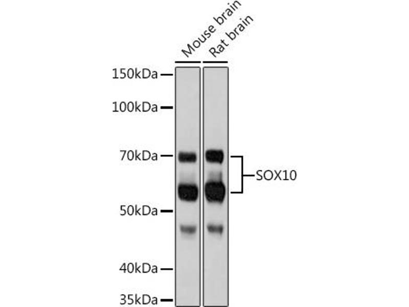 This gene encodes a member of the SOX (SRY-related HMG-box) family of transcription factors involved in the regulation of embryonic development and in the determination of the cell fate. The encoded protein may act as a transcriptional activator after forming a protein complex with other proteins. This protein acts as a nucleocytoplasmic shuttle protein and is important for neural crest and peripheral nervous system development. Mutations in this gene are associated with Waardenburg-Shah and Waardenburg-Hirschsprung disease. [provided by RefSeq, Jul 2008],DOM, PCWH, WS2E, WS4, WS4C,Cell Biology & Developmental Biology,Cell Type Marker,Cell Type Marker_Neural Stem Cell marker,Epigenetics & Nuclear Signaling,Neuroscience,Stem Cells,Transcription Factors,SOX10