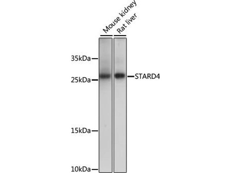 Cholesterol homeostasis is regulated, at least in part, by sterol regulatory element (SRE)-binding proteins (e.g., SREBP1, MIM 184756) and by liver X receptors (e.g., LXRA, MIM 602423). Upon sterol depletion, LXRs are inactive and SREBPs are cleaved, after which they bind promoter SREs and activate genes involved in cholesterol biosynthesis and uptake. Sterol transport is mediated by vesicles or by soluble protein carriers, such as steroidogenic acute regulatory protein (STAR, MIM 600617). STAR is homologous to a family of proteins containing a 200- to 210-amino acid STAR-related lipid transfer (START) domain, including STARD4 (Soccio et al., 2002 [PubMed 12011452]).,STARD4,Cancer,Signal Transduction,Endocrine & Metabolism,Lipid Metabolism,Cholesterol Metabolism,Cardiovascular,Lipids,STARD4