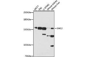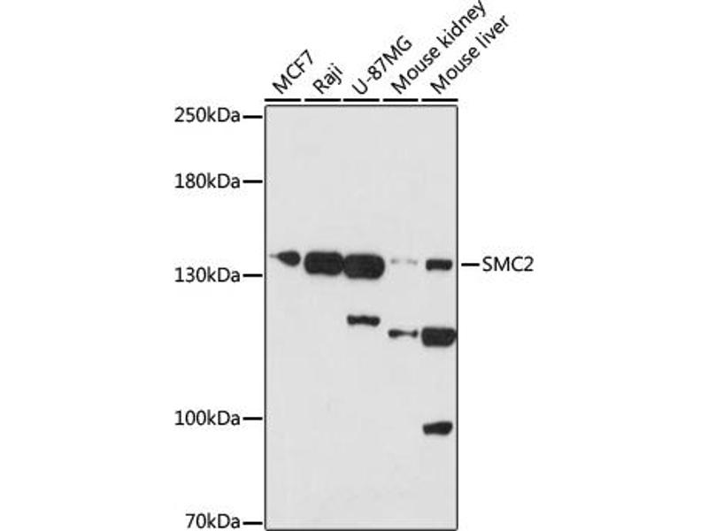 Central component of the condensin complex, a complex required for conversion of interphase chromatin into mitotic-like condense chromosomes. The condensin complex probably introduces positive supercoils into relaxed DNA in the presence of type I topoisomerases and converts nicked DNA into positive knotted forms in the presence of type II topoisomerases.,SMC2,CAP-E,CAPE,SMC-2,SMC2L1,Epigenetics & Nuclear Signaling,Cell Biology & Developmental Biology,Apoptosis,Cell Cycle,SMC2