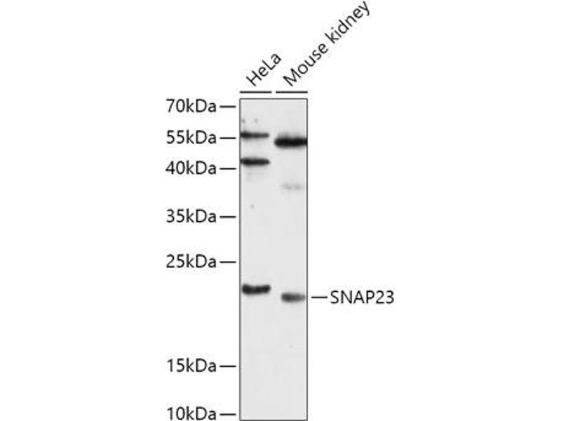 Specificity of vesicular transport is regulated, in part, by the interaction of a vesicle-associated membrane protein termed synaptobrevin/VAMP with a target compartment membrane protein termed syntaxin. These proteins, together with SNAP25 (synaptosome-associated protein of 25 kDa), form a complex which serves as a binding site for the general membrane fusion machinery. Synaptobrevin/VAMP and syntaxin are believed to be involved in vesicular transport in most, if not all cells, while SNAP25 is present almost exclusively in the brain, suggesting that a ubiquitously expressed homolog of SNAP25 exists to facilitate transport vesicle/target membrane fusion in other tissues. The protein encoded by this gene is structurally and functionally similar to SNAP25 and binds tightly to multiple syntaxins and synaptobrevins/VAMPs. It is an essential component of the high affinity receptor for the general membrane fusion machinery and is an important regulator of transport vesicle docking and fusion. Two alternative transcript variants encoding different protein isoforms have been described for this gene.,SNAP23,HsT17016,SNAP-23,SNAP23A,SNAP23B,Neuroscience,Cell Type Marker,Neuron marker,Synapse marker,SNAP23