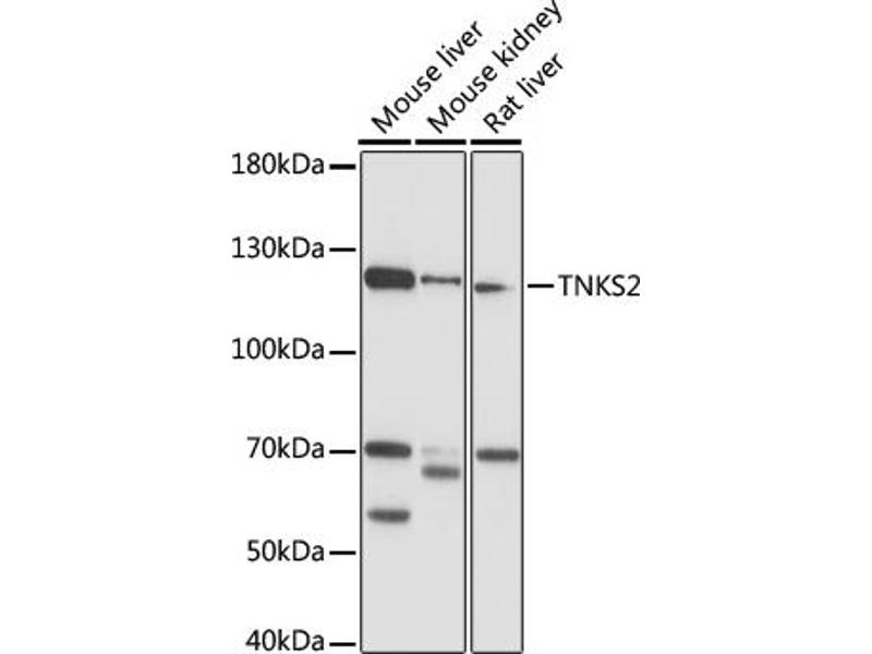Poly-ADP-ribosyltransferase involved in various processes such as Wnt signaling pathway, telomere length and vesicle trafficking. Acts as an activator of the Wnt signaling pathway by mediating poly-ADP-ribosylation of AXIN1 and AXIN2, 2 key components of the beta-catenin destruction complex: poly-ADP-ribosylated target proteins are recognized by RNF146, which mediates their ubiquitination and subsequent degradation. Also mediates poly-ADP-ribosylation of BLZF1 and CASC3, followed by recruitment of RNF146 and subsequent ubiquitination. Mediates poly-ADP-ribosylation of TERF1, thereby contributing to the regulation of telomere length. Stimulates 26S proteasome activity.,TNKS2,ARTD6,PARP-5b,PARP-5c,PARP5B,PARP5C,TANK2,TNKL,pART6,Epigenetics & Nuclear Signaling,Signal Transduction,Cell Biology & Developmental Biology,Cell Cycle,Centrosome,Wnt/β-Catenin Signaling Pathway,TNKS2