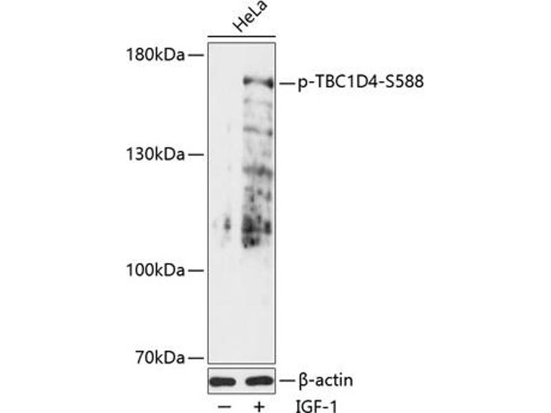 This gene is a member of the Tre-2/BUB2/CDC16 domain family. The protein encoded by this gene is a Rab-GTPase-activating protein, and contains two phopshotyrosine-binding domains (PTB1 and PTB2), a calmodulin-binding domain (CBD), a Rab-GTPase domain, and multiple AKT phosphomotifs. This protein is thought to play an important role in glucose homeostasis by regulating the insulin-dependent trafficking of the glucose transporter 4 (GLUT4), important for removing glucose from the bloodstream into skeletal muscle and fat tissues. Reduced expression of this gene results in an increase in GLUT4 levels at the plasma membrane, suggesting that this protein is important in intracellular retention of GLUT4 under basal conditions. When exposed to insulin, this protein is phosphorylated, dissociates from GLUT4 vesicles, resulting in increased GLUT4 at the cell surface, and enhanced glucose transport. Phosphorylation of this protein by AKT is required for proper translocation of GLUT4 to the cell surface. Individuals homozygous for a mutation in this gene are at higher risk for type 2 diabetes and have higher levels of circulating glucose and insulin levels after glucose ingestion. Alternative splicing results in multiple transcript variants encoding different isoforms.,AS160,NIDDM5,TBC1D4,Signal Transduction,G protein signaling,Signal Transduction,PI3K-Akt Signaling Pathway,Endocrine & Metabolism,Insulin Receptor Signaling Pathway,Protein phosphorylation,TBC1D4