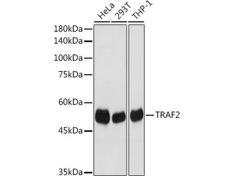 The protein encoded by this gene is a member of the TNF receptor associated factor (TRAF) protein family. TRAF proteins associate with, and mediate the signal transduction from members of the TNF receptor superfamily. This protein directly interacts with TNF receptors, and forms a heterodimeric complex with TRAF1. This protein is required for TNF-alpha-mediated activation of MAPK8/JNK and NF-kappaB. The protein complex formed by this protein and TRAF1 interacts with the inhibitor-of-apoptosis proteins (IAPs), and functions as a mediator of the anti-apoptotic signals from TNF receptors. The interaction of this protein with TRADD, a TNF receptor associated apoptotic signal transducer, ensures the recruitment of IAPs for the direct inhibition of caspase activation. BIRC2/c-IAP1, an apoptosis inhibitor possessing ubiquitin ligase activity, can unbiquitinate and induce the degradation of this protein, and thus potentiate TNF-induced apoptosis. Multiple alternatively spliced transcript variants have been found for this gene, but the biological validity of only one transcript has been determined. [provided by RefSeq, Jul 2008],MGC:45012,TRAP,TRAP3,TRAF2,Apoptosis,Apoptosis_Inhibition of Apoptosis,Autophagy,Cancer,Cardiovascular,Cell Biology & Developmental Biology,Death Receptor Signaling Pathway,Growth factors,Growth factors_TNF,Immunology & Inflammation,MAPK-JNK Signaling Pathway,MAPK-P38 Signaling Pathway,NF-kB Signaling Pathway,Signal Transduction,TRAF2
