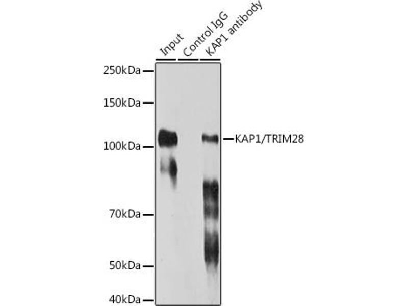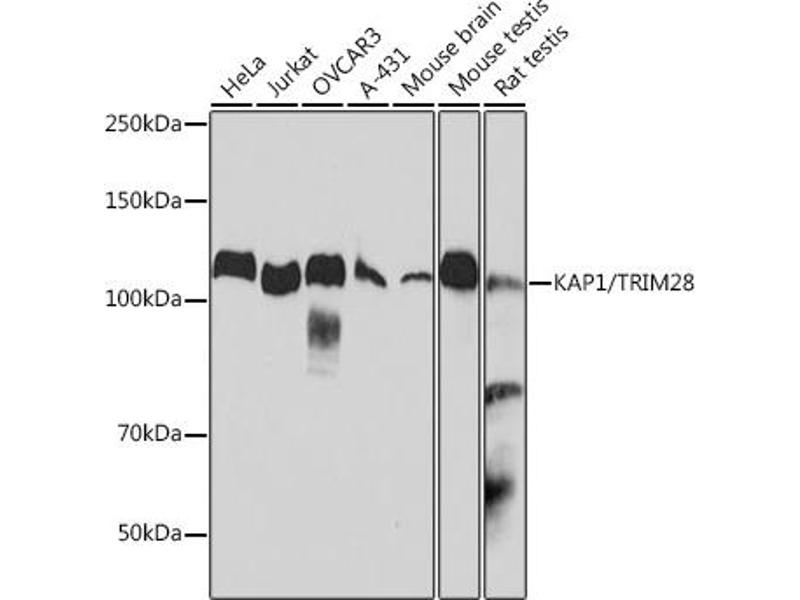 The protein encoded by this gene mediates transcriptional control by interaction with the Kruppel-associated box repression domain found in many transcription factors. The protein localizes to the nucleus and is thought to associate with specific chromatin regions. The protein is a member of the tripartite motif family. This tripartite motif includes three zinc-binding domains, a RING, a B-box type 1 and a B-box type 2, and a coiled-coil region. [provided by RefSeq, Jul 2008],KAP1,PPP1R157,RNF96,TF1B,TIF1B,TRIM28,Apoptosis,Cancer,Cell Biology & Developmental Biology,Epigenetics & Nuclear Signaling,Invasion and Metastasis,Protein phosphorylation,Transcription Factors,Ubiquitin,TRIM28