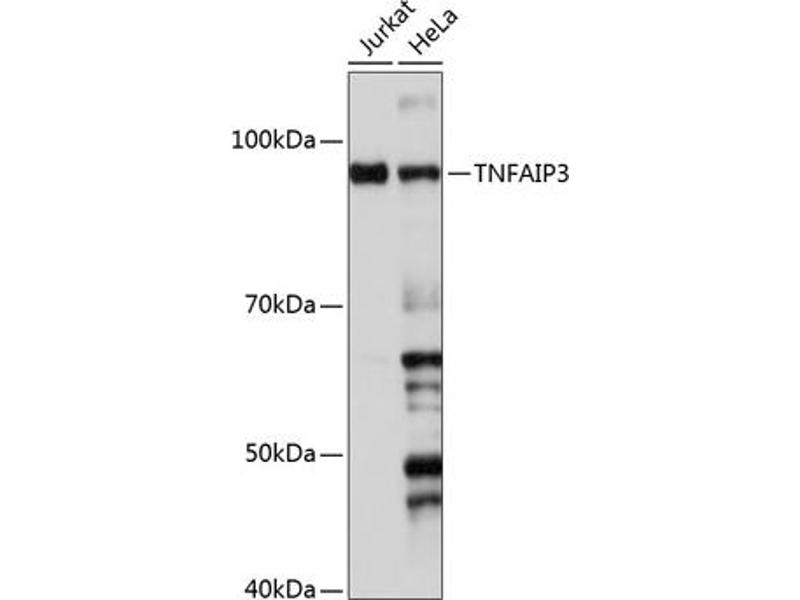 This gene was identified as a gene whose expression is rapidly induced by the tumor necrosis factor (TNF). The protein encoded by this gene is a zinc finger protein and ubiqitin-editing enzyme, and has been shown to inhibit NF-kappa B activation as well as TNF-mediated apoptosis. The encoded protein, which has both ubiquitin ligase and deubiquitinase activities, is involved in the cytokine-mediated immune and inflammatory responses. Several transcript variants encoding the same protein have been found for this gene. [provided by RefSeq, Jul 2012],A20,AISBL,OTUD7C,TNFA1P2,TNFAIP3,Apoptosis,Apoptosis_Inhibition of Apoptosis,Cancer,Cell Biology & Developmental Biology,Cell Intrinsic Innate Immunity Signaling Pathway,Cytokines,Cytokines_TNF,Epigenetics & Nuclear Signaling,Growth factors,Growth factors_TNF,Immunology & Inflammation,NF-kB Signaling Pathway,Signal Transduction,Toll-like Receptor Signaling Pathway,Ubiquitin,TNFAIP3
