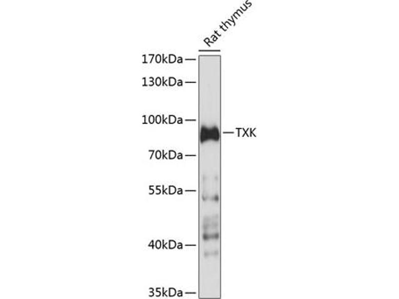 Non-receptor tyrosine kinase that plays a redundant role with ITK in regulation of the adaptive immune response. Regulates the development, function and differentiation of conventional T-cells and nonconventional NKT-cells. When antigen presenting cells (APC activate T-cell receptor (TCR, a series of phosphorylation leads to the recruitment of TXK to the cell membrane, where it is phosphorylated at Tyr-420. Phosphorylation leads to TXK full activation. Contributes also to signaling from many receptors and participates in multiple downstream pathways, including regulation of the actin cytoskeleton. Like ITK, can phosphorylate PLCG1, leading to its localization in lipid rafts and activation, followed by subsequent cleavage of its substrates. In turn, the endoplasmic reticulum releases calcium in the cytoplasm and the nuclear activator of activated T-cells (NFAT translocates into the nucleus to perform its transcriptional duty. Plays a role in the positive regulation of IFNG transcription in T-helper 1 cells as part of an IFNG promoter-binding complex with PARP1 and EEF1A1. Within the complex, phosphorylates both PARP1 and EEF1A1. Phosphorylates also key sites in LCP2 leading to the up-regulation of Th1 preferred cytokine IL-2. Phosphorylates 'Tyr-201' of CTLA4 which leads to the association of PI-3 kinase with the CTLA4 receptor.,TXK,BTKL,PSCTK5,PTK4,RLK,TKL,Epigenetics & Nuclear Signaling,Signal Transduction,Kinase,Tyrosine kinases,Immunology & Inflammation,Cytokines,Interferons,Cell Intrinsic Innate Immunity Signaling Pathway,TXK