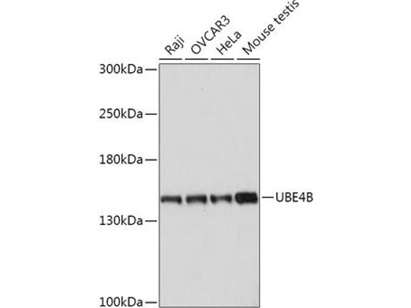 The modification of proteins with ubiquitin is an important cellular mechanism for targeting abnormal or short-lived proteins for degradation. Ubiquitination involves at least three classes of enzymes: ubiquitin-activating enzymes, or E1s, ubiquitin-conjugating enzymes, or E2s, and ubiquitin-protein ligases, or E3s. This gene encodes an additional conjugation factor, E4, which is involved in multiubiquitin chain assembly. This gene is also the strongest candidate in the neuroblastoma tumor suppressor genes. Alternatively spliced transcript variants encoding distinct isoforms have been found for this gene. [provided by RefSeq, Jul 2008],E4,HDNB1,UBOX3,UFD2,UFD2A,UBE4B,Epigenetics & Nuclear Signaling,Cell Biology & Developmental Biology,Apoptosis,Cell Cycle,Ubiquitin,Ubiquitin-Proteasome Signaling Pathway,UBE4B