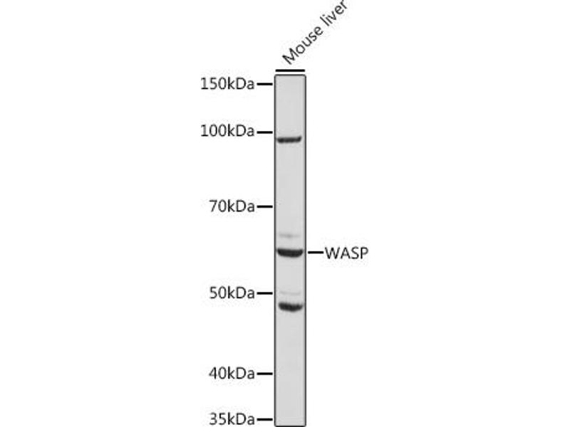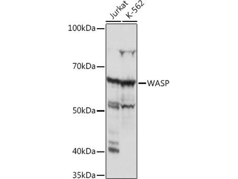 The Wiskott-Aldrich syndrome (WAS) family of proteins share similar domain structure, and are involved in transduction of signals from receptors on the cell surface to the actin cytoskeleton. The presence of a number of different motifs suggests that they are regulated by a number of different stimuli, and interact with multiple proteins. Recent studies have demonstrated that these proteins, directly or indirectly, associate with the small GTPase, Cdc42, known to regulate formation of actin filaments, and the cytoskeletal organizing complex, Arp2/3. Wiskott-Aldrich syndrome is a rare, inherited, X-linked, recessive disease characterized by immune dysregulation and microthrombocytopenia, and is caused by mutations in the WAS gene. The WAS gene product is a cytoplasmic protein, expressed exclusively in hematopoietic cells, which show signalling and cytoskeletal abnormalities in WAS patients. A transcript variant arising as a result of alternative promoter usage, and containing a different 5' UTR sequence, has been described, however, its full-length nature is not known. [provided by RefSeq, Jul 2008],IMD2, SCNX, THC, THC1, WASP, WASPA,Cell Adhesion,Cell Biology & Developmental Biology,Cytoskeleton,Cytoskeleton_Actins,Immunology & Inflammation,Signal Transduction,T Cell Receptor Signaling Pathway,WAS