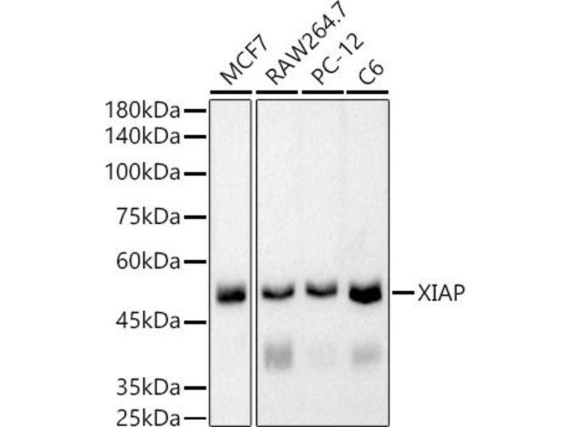 This gene encodes a protein that belongs to a family of apoptotic suppressor proteins. Members of this family share a conserved motif termed, baculovirus IAP repeat, which is necessary for their anti-apoptotic function. This protein functions through binding to tumor necrosis factor receptor-associated factors TRAF1 and TRAF2 and inhibits apoptosis induced by menadione, a potent inducer of free radicals, and interleukin 1-beta converting enzyme. This protein also inhibits at least two members of the caspase family of cell-death proteases, caspase-3 and caspase-7. Mutations in this gene are the cause of X-linked lymphoproliferative syndrome. Alternate splicing results in multiple transcript variants. Pseudogenes of this gene are found on chromosomes 2 and 11.,XIAP,API3,BIRC4,IAP-3,ILP1,MIHA,XLP2,hIAP-3,hIAP3,Cancer,Invasion and Metastasis,Signal Transduction,PI3K-Akt Signaling Pathway,ErbB-HER Signaling Pathway,Cell Biology & Developmental Biology,Apoptosis,Caspases,Death receptors & ligands,Mitochondrial Control of Apoptosis,Inhibition of Apoptosis,Ubiquitin,Ubiquitin-Proteasome Signaling Pathway,Death Receptor Signaling Pathway,Endocrine & Metabolism,Mitochondrial metabolism,XIAP