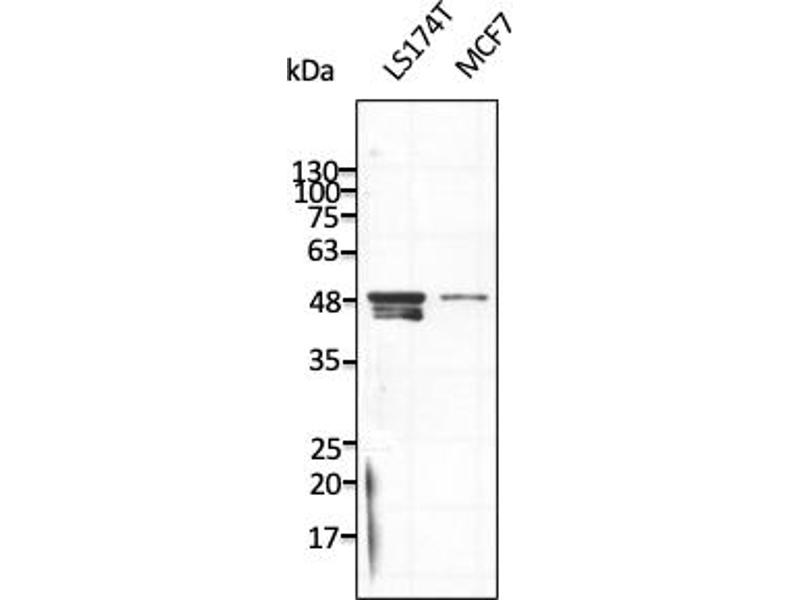 Detects endogenous levels of all variants (var1 52 KDa, var2 49.5 KDa, var3 27.3 KDa, var4 44.8KDa, var5 41.7 KDa, var6 41.7 KDa) of TUBB in different cell lines by Western blot.
