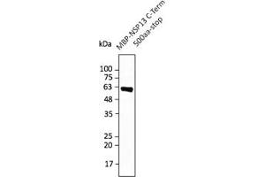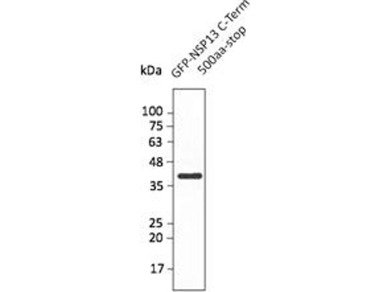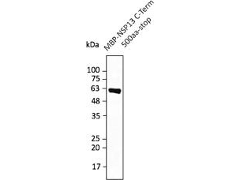 - Affinity purified recombinant fusion protein using the C-terminal of Nsp13 (residues 500 to stop) and produced in E. coli.