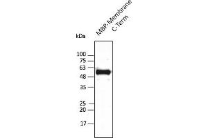 - Affinity purified recombinant fusion protein using the C-terminal of Membrane protein (residues 100 to stop) and produced in E. coli.