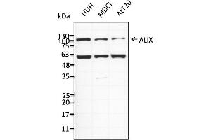 Detects endogenous levels of ALIX in HUH, MDCK, AtT20, MCF7, COS7, HT1080 and MCR by Western blot.