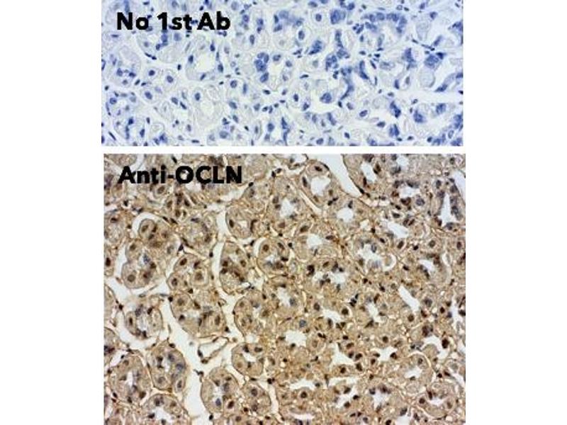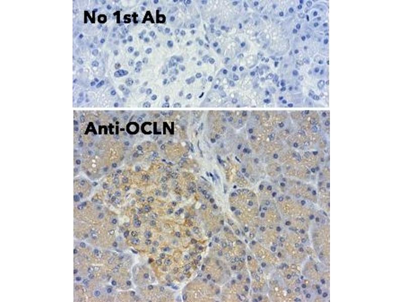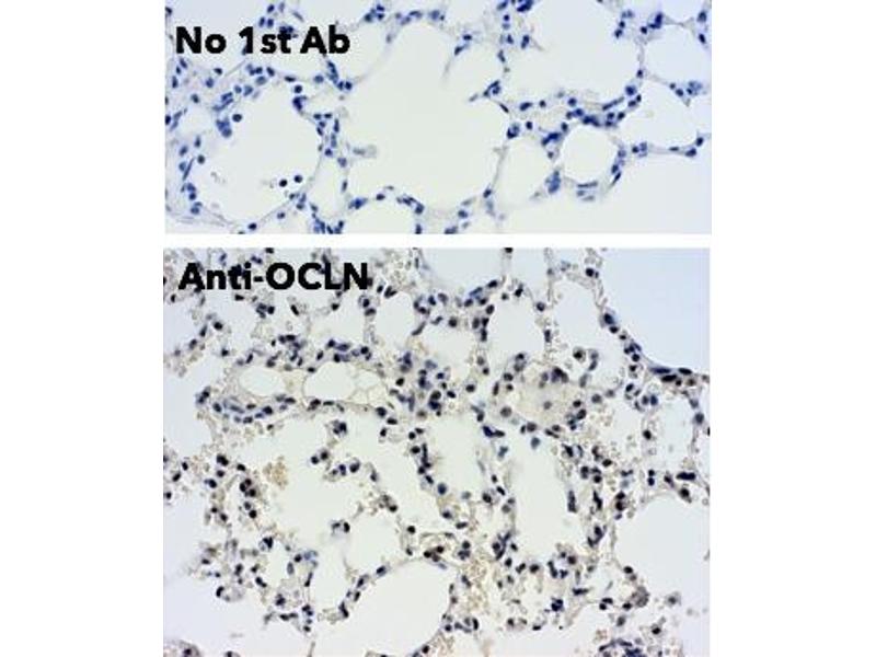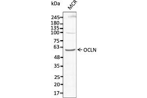 Detects endogenous levels of OCLN in MCR, IMCD3, COS7, MDCK, HUH, HEK293, MCF7, mouse brain by Western blot.