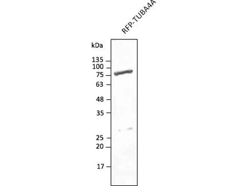In 293HEK cells transfected with cds plasmid detects a band of 55 kDa by Western blot. It also detects tdTomato in brain sections by IHC. This antibody is specific for tdTomato and mCherry proteins. It does not cross-react to GFP (green fluorescent protein).