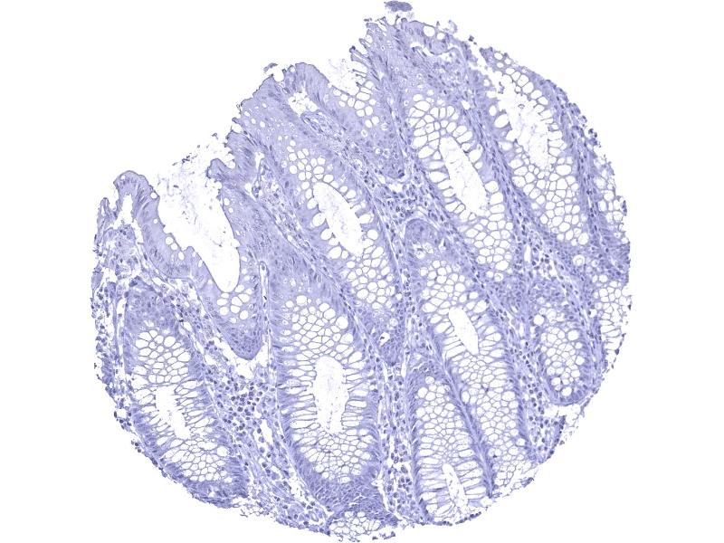 Negative Control: Colon: Calbindin 1 immunostaining should be completely absent in all cells.