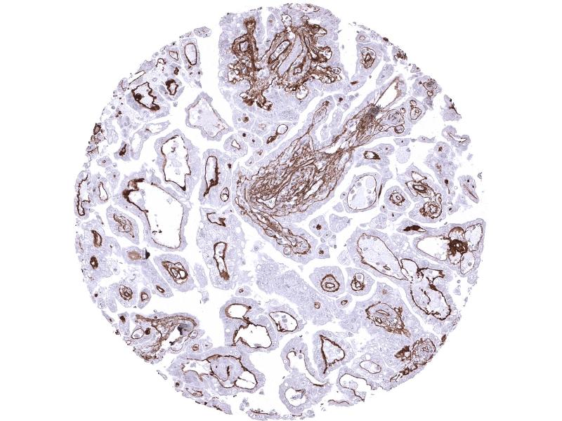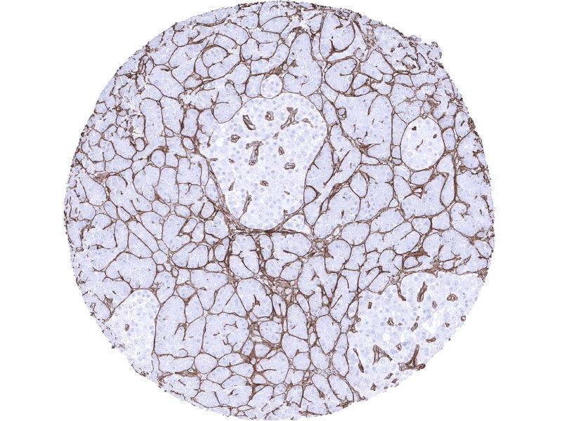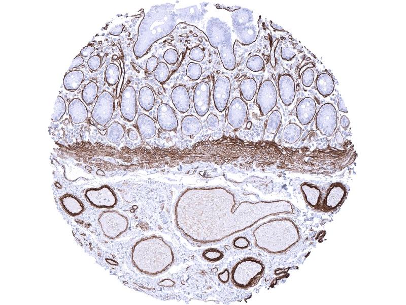 Positive Control: Colon: An at least moderate collagen IV immunostaining of basement membranes and a strong staining of vessels and the tunica muscularis mucosa should be seen.