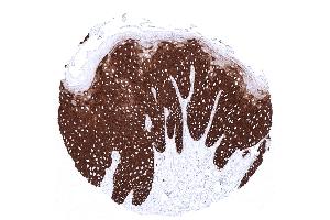 Positive Control: Tonsil: A strong KRT14 immunostaining should be seen in the surface and crypt epithelium.