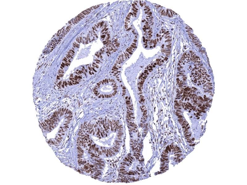 Negative Control: Colon adenocarcinoma with previously documented loss of MSH6 expression: Nuclear staining should be absent in cancer cells, while a nuclear staining must be seen in stromal and inflammatory cells.