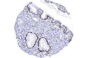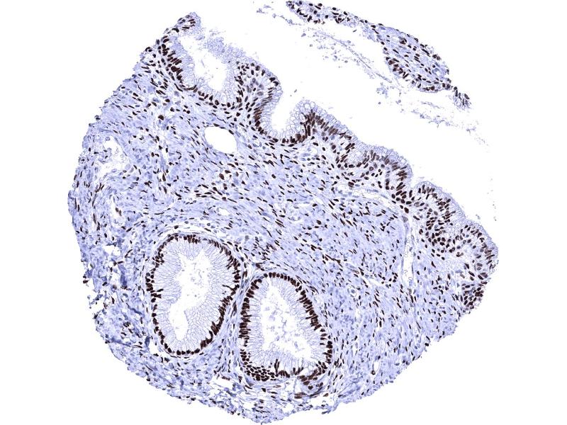 Positive Control: Uterine cervix: almost all columnar epithelial cells, basal squamous epithelial cells and most of the stromal cells must show a strong nuclear staining with only minimal cytoplasmic staining.