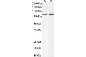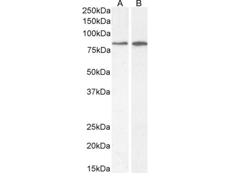Western Blot: Approx 85 kDa band observed in lysates of cell limes A549 and Caco-2, and in preliminary testing of cell lines HeLa, HEK293 and U251 lysate (calculated MW of 89.3 kDa according to NP_588614.1). Recommended concentration: 1-3 μg/mL. Primary inc