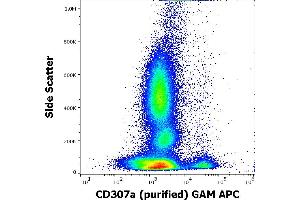 Fc receptor like 1,CD307a is a type I transmembrane glycoprotein of the Fc receptor family. It contains two ITAM motifs in its cytoplasmic domain. CD307a is expressed mainly on the surface of mature B-cells, and is down-regulated in germinal center B-cells. Expression of CD307a is higher in patients with autoimmune diseases, compared with healthy controls.,FcRL1, FcRH1, IRTA5