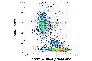 - CD52 Molecule,CD52 (CAMPATH-1, HE5) is a highly glycosylated GPI-anchored 21-28 kDa glycopeptide which is present at high levels on lymphocytes, macrophages, epithelial cells of male reproductive tract and mature sperm. Its 12-amino acid beckbone carries a complex N-linked carbohydrate moiety, which differs between sperm and leukocyte CD52, as well as the GPI anchor does. CD52 can be acquired by sperm cells from seminal plasma, where it is released by epithelial cells. Although CD52 is not an essential T-cell costimulator, its triggering results in activation of normal human T cells. CD52 is a very good target for antibody/complement-mediated cell lysis.,CAMPATH-1, HE5, ESPE5