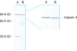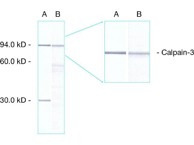 - This antibody reacts with full-size calpain 3 (94 kD) plus an additional fragment at 30 kD in human skeletal muscle. A band of 94 kD is seen with rabbit and dog muscle while extracts of hamster muscle show reactivity with the 94 kD band and a larger species of approximately 110 kD. This 110 kD band is the principal immunoreactive species seen in rat muscle extracts. This antibody produces no bands with mouse, pig or chicken muscle.