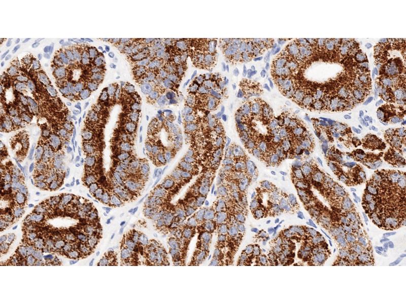 Immunohistochemistry on paraffin sections. Suggested dilution: 1:200 for 30 minutes at 25°C. Heat induced epitope retrieval using Epitope Retrieval Solution pH 9.0. This is provided as a guide and users should determine their own optimal working dilutions. Technical note: When utilised in immunohistochemistry, the use of H2O2 to block endogenous peroxidase has been shown to have a detrimental effect on the epitope recognized. It is, therefore, CRITICAL that blocking with H2O2 should be carried out after application of the primary antibody with solutions of no greater than 3 % . If these recommendations are not followed, staining intensity will be reduced. It is not recommended for use with PBS, since the use of PBS based wash buffers and possibly PBS based antibody diluents gives increased background staining and decreased staining intensity. Immunohistochemical (IHC) staining techniques allow for the visualization of antigens via the sequential application of a specific antibody to the antigen (primary antibody), a secondary antibody to the primary antibody and an enzyme complex with a chromogenic substrate with interposed washing steps. The enzymatic activation of the chromogen results in a visible reaction product at the antigen site. The specimen may then be counterstained and coverslipped. Results are interpreted using a light microscope.