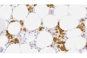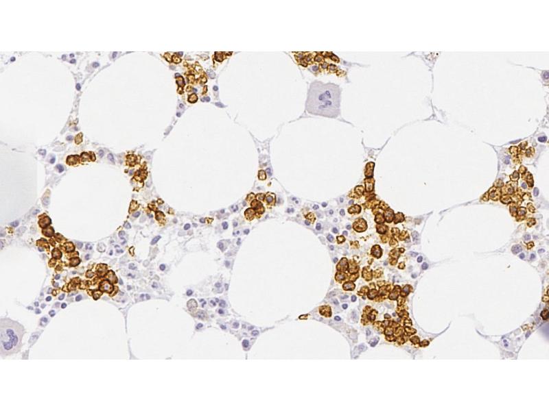 Immunohistochemistry on paraffin sections. Heat Induced Epitope Retrieval (HIER): Epitope Retrieval Solution pH 6. Suggested dilution: 1:80 for 30 minutes at 25 °C. This is provided as a guide and users should determine their own optimal working dilutions. Immunohistochemical (IHC) staining techniques allow for the visualization of antigens via the sequential application of a specific antibody to the antigen (primary antibody), a secondary antibody to the primary antibody and an enzyme complex with a chromogenic substrate with interposed washing steps. The enzymatic activation of the chromogen results in a visible reaction product at the antigen site. The specimen may then be counterstained and coverslipped. Results are interpreted using a light microscope.