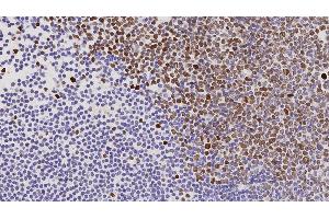 Immunohistochemistry on paraffin sections. Suggested dilution: 1:200 for 30 minutes at 25°C. Heat induced epitope retrieval using Epitope Retrieval Solution pH 6.0. This is provided as a guide and users should determine their own optimal working dilutions.,Immunohistochemical (IHC) staining techniques allow for the visualization of antigens via the sequential application of a specific antibody to the antigen (primary antibody), a secondary antibody to the primary antibody and an enzyme complex with a chromogenic substrate with interposed washing steps. The enzymatic activation of the chromogen results in a visible reaction product at the antigen site. The specimen may then be counterstained and coverslipped. Results are interpreted using a light microscope.